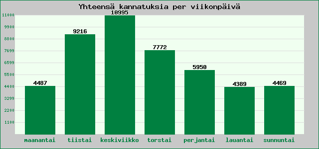 | maanantai: tiistai: keskiviikko: torstai: perjantai: lauantai: sunnuntai: | 4487 9216 10995 7772 5950 4389 4469 | 172 354 422 298 228 168 171 |